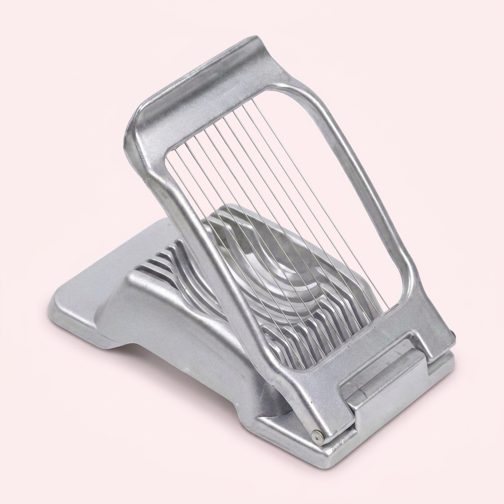Denne æggeskærer er et praktisk redskab designet til at skære kogte æg i ensartede skiver. Med en rustfri stål æggeskærer bliver det nemt og hurtigt at forberede æg til morgenbordet, salater eller smørrebrød. Dette køkkenredskab æg gør madlavningen mere praktisk og præcis, og sikrer at dine æg altid fremstår indbydende.