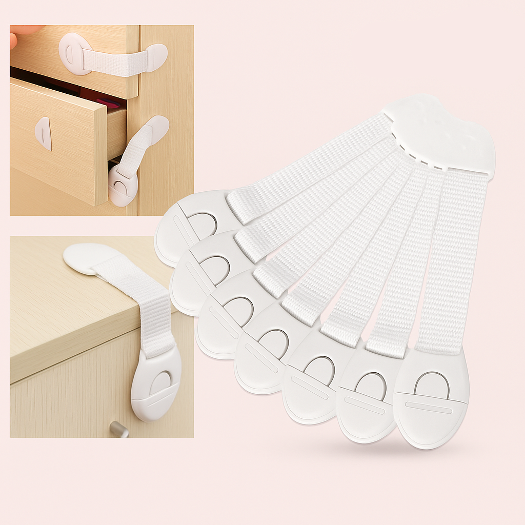 Børnesikring til skabe og vinduer – Justerbare låse i hvid, holdbar plast