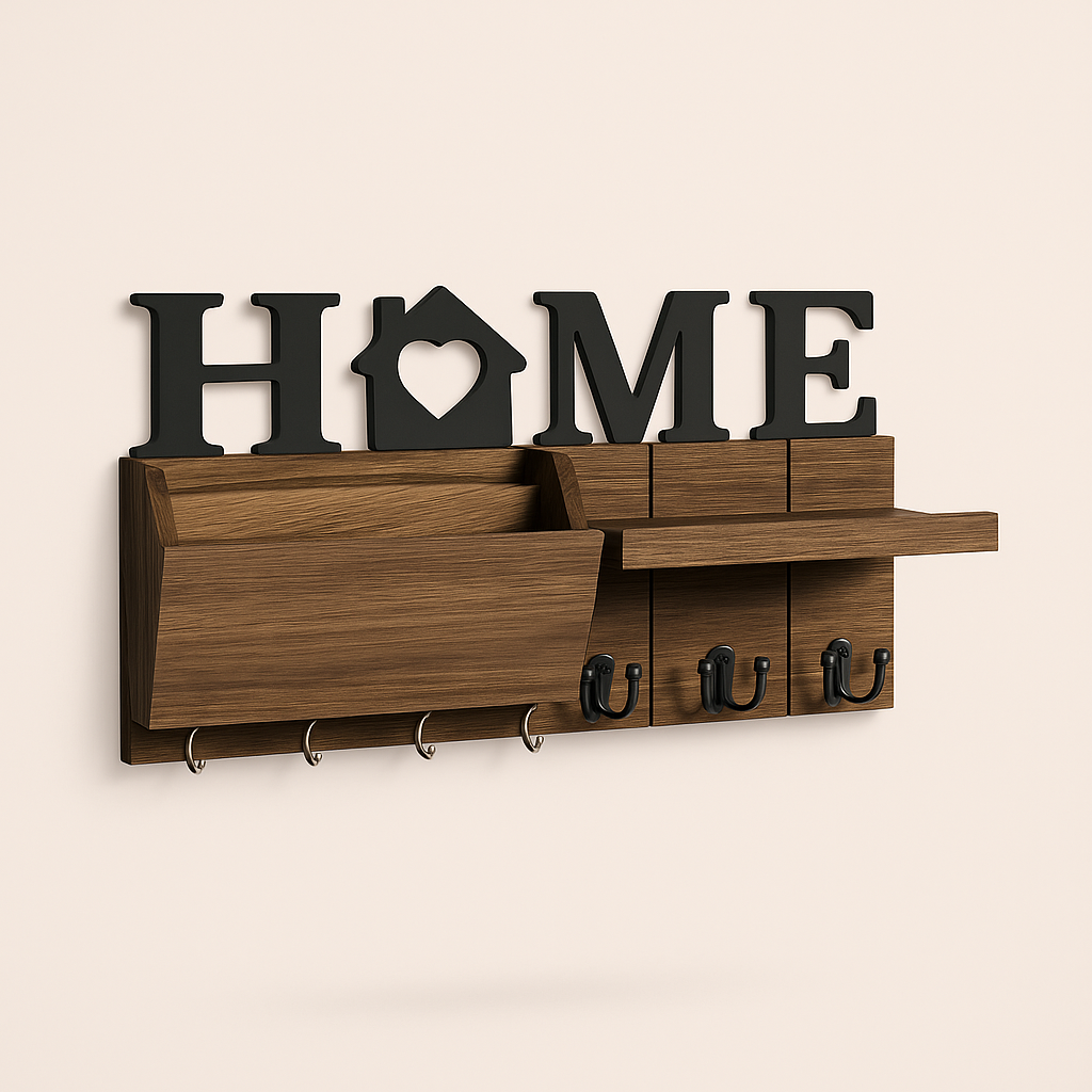 Denne funktionelle nøgleholder i trædesign organiserer nøgler og småting i entréen. Den elegante væg nøgleholder er designet til at skabe orden og samtidig tilføje et hyggeligt ‘HOME’-element til din indretning. Den kombinerer praktisk opbevaring med et stilrent udtryk, som er velegnet til hverdagsbrug og bidrager til et ryddeligt førstehåndsindtryk af dit hjem.