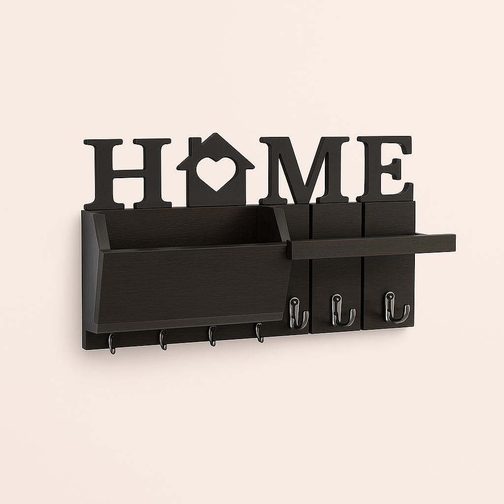 Nøgleholder i træ – Brun, Sort, Hvid til organiseret entré med ‘HOME’-design