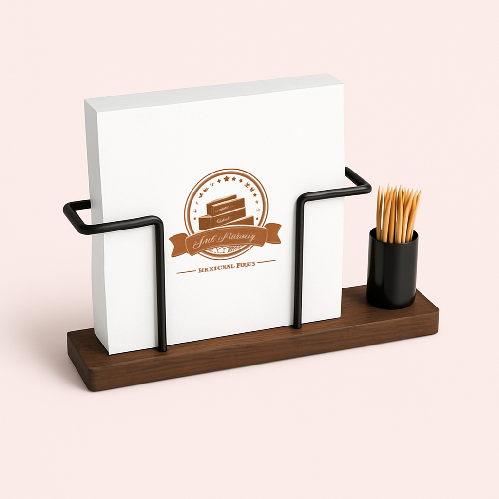 Dette produkt kombinerer mørkebrunt træ og sort metal med en praktisk tandstikkerholder. Den tilføjer et rent, skandinavisk udtryk til ethvert bord og er en stilfuld bordpynt servietholder.