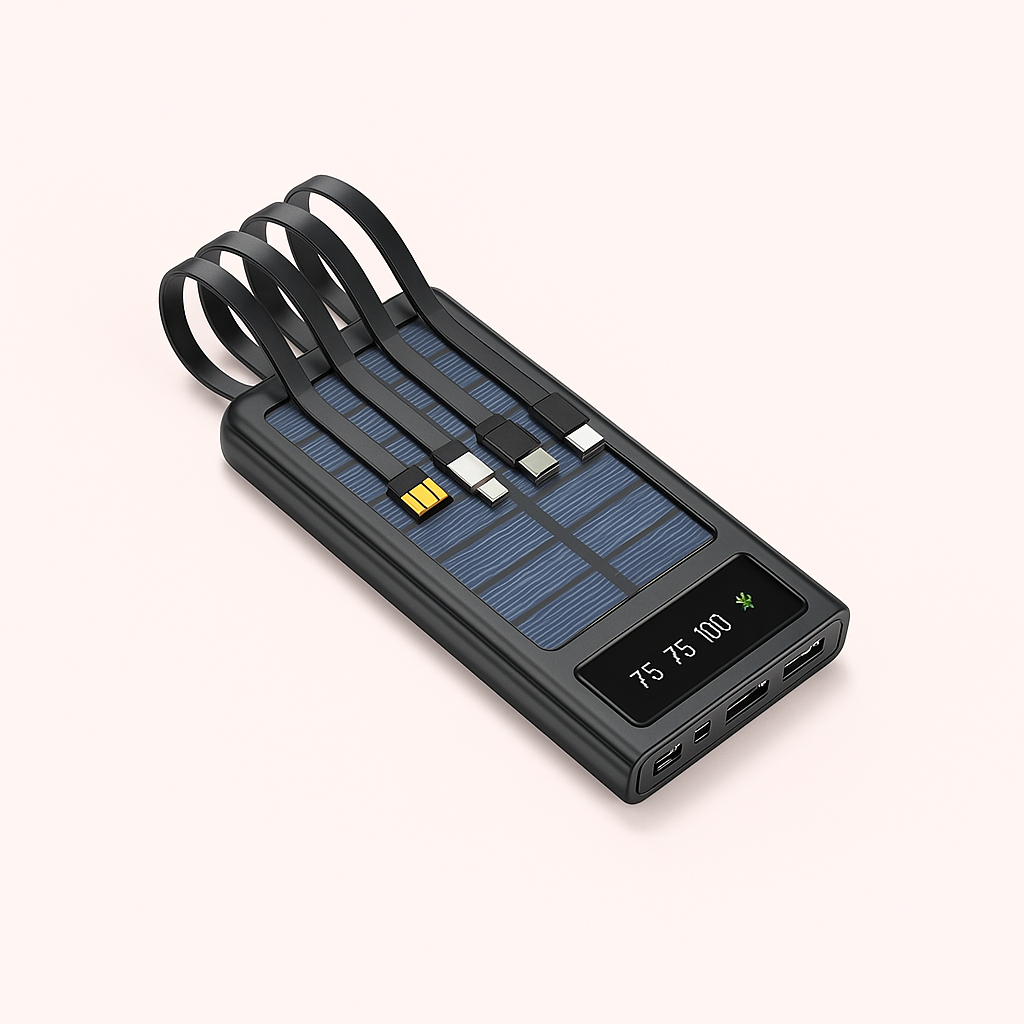 Denne solcelle powerbank kombinerer funktionalitet med et brugervenligt og robust design. Den er udstyret med praktiske solpaneler, der giver en alternativ og miljøvenlig måde at genoplade powerbanken på, hvilket er ideelt, når du er væk fra en stikkontakt. De fire udtrækkelige kabler eliminerer behovet for at medbringe ekstra opladerkabler, hvilket gør denne powerbank med solceller til en minimalistisk og pladsbesparende løsning for den moderne bruger. Uanset om du skal oplade din smartphone, tablet eller et andet gadget, giver denne enhed dig friheden til det. Det integrerede LED-display giver dig altid et klart og hurtigt overblik over den resterende strøm, så du aldrig bliver overrasket.